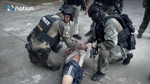 Hình ảnh do cảnh sát cung cấp cho thấy nghi phạm đi chân trần, mặc quần ngắn và áo thun, bị các sĩ quan có vũ trang khống chế và ghì xuống đất - Ảnh: THE NATION |