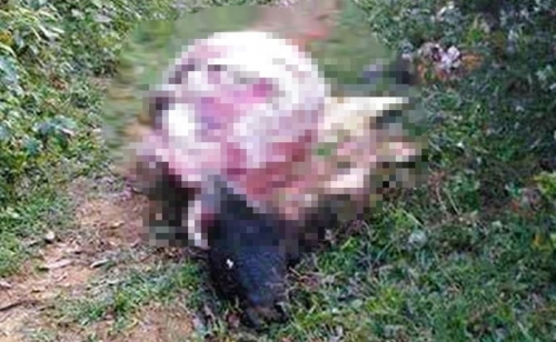 Con trâu bị xẻ thịt bỏ lại phần đầu và nội tạng ở bìa rừng |