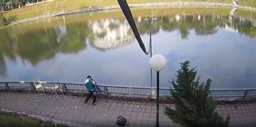 Sau khi dùng hung khí tấn công, nam sinh đã đẩy bạn xuống hồ nước. Ảnh: Cắt từ clip |