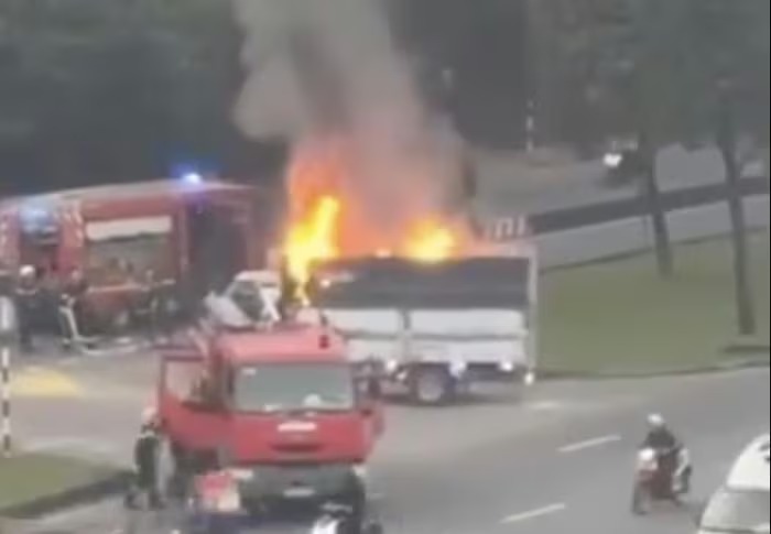 Xe tải bị bốc cháy. |