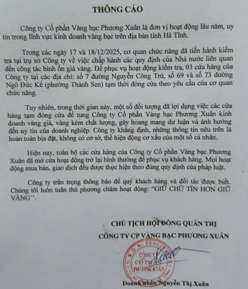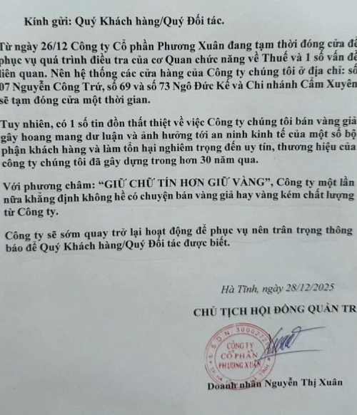 Trước làn sóng đồn đoán, Công ty Cổ phần Vàng bạc Phương Xuân đã dán thông báo tại các cửa hàng, khẳng định việc tạm đóng cửa là để phục vụ quá trình điều tra của cơ quan chức năng về thuế và một số vấn đề liên quan. Doanh nghiệp cũng phủ nhận các “tin đồn thất thiệt” liên quan đến việc bán vàng giả, cho rằng những thông tin này gây hoang mang dư luận và ảnh hưởng nghiêm trọng đến uy tín thương hiệu hơn 30 năm qua.