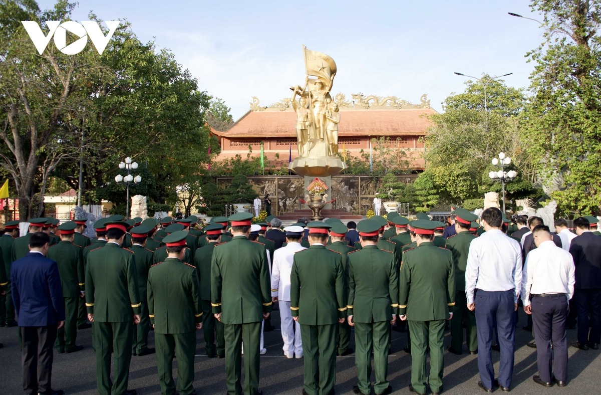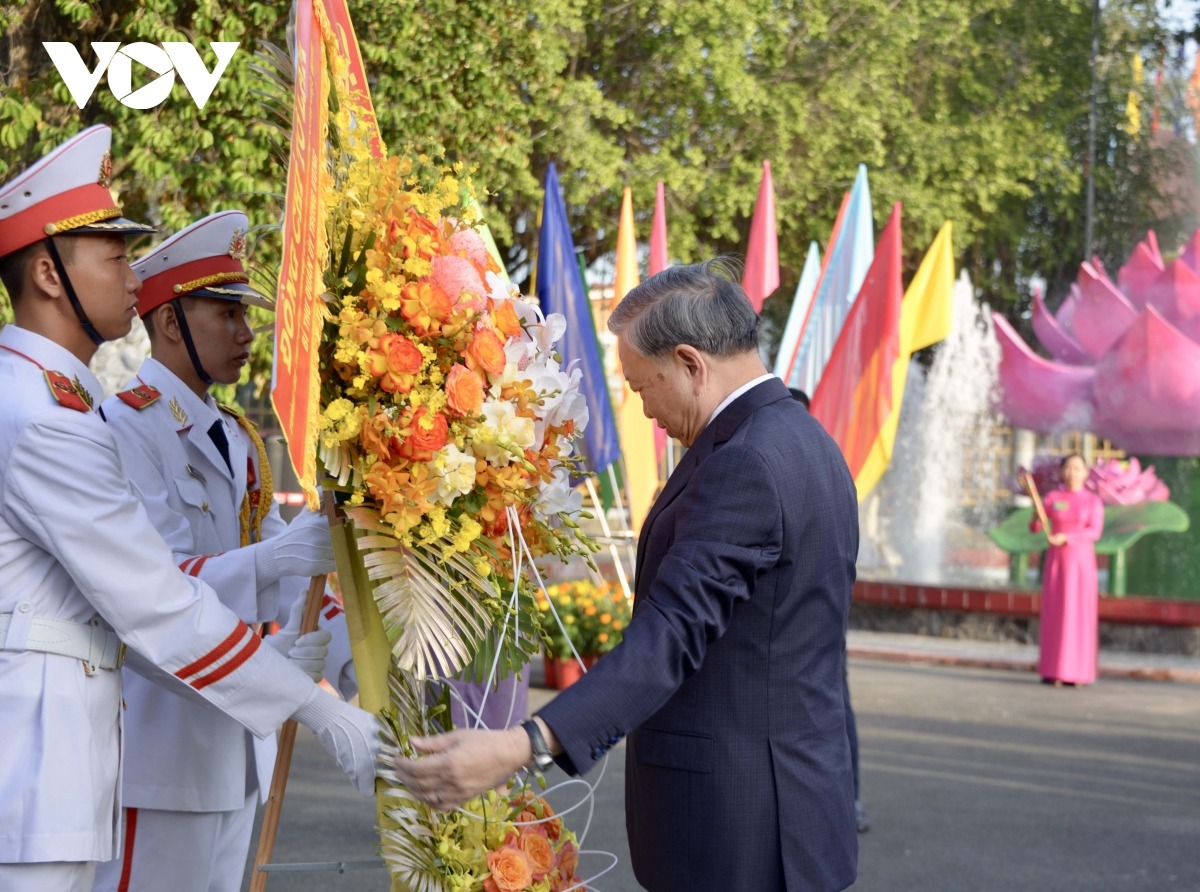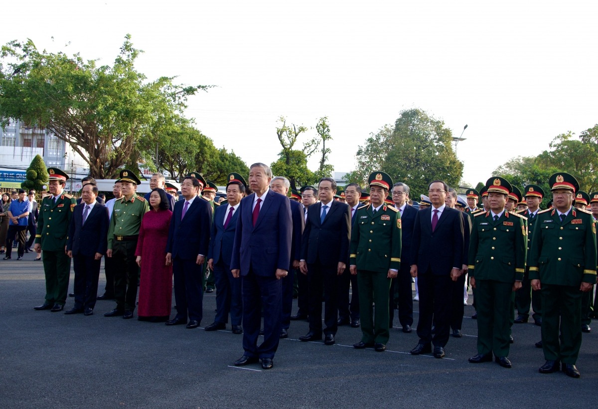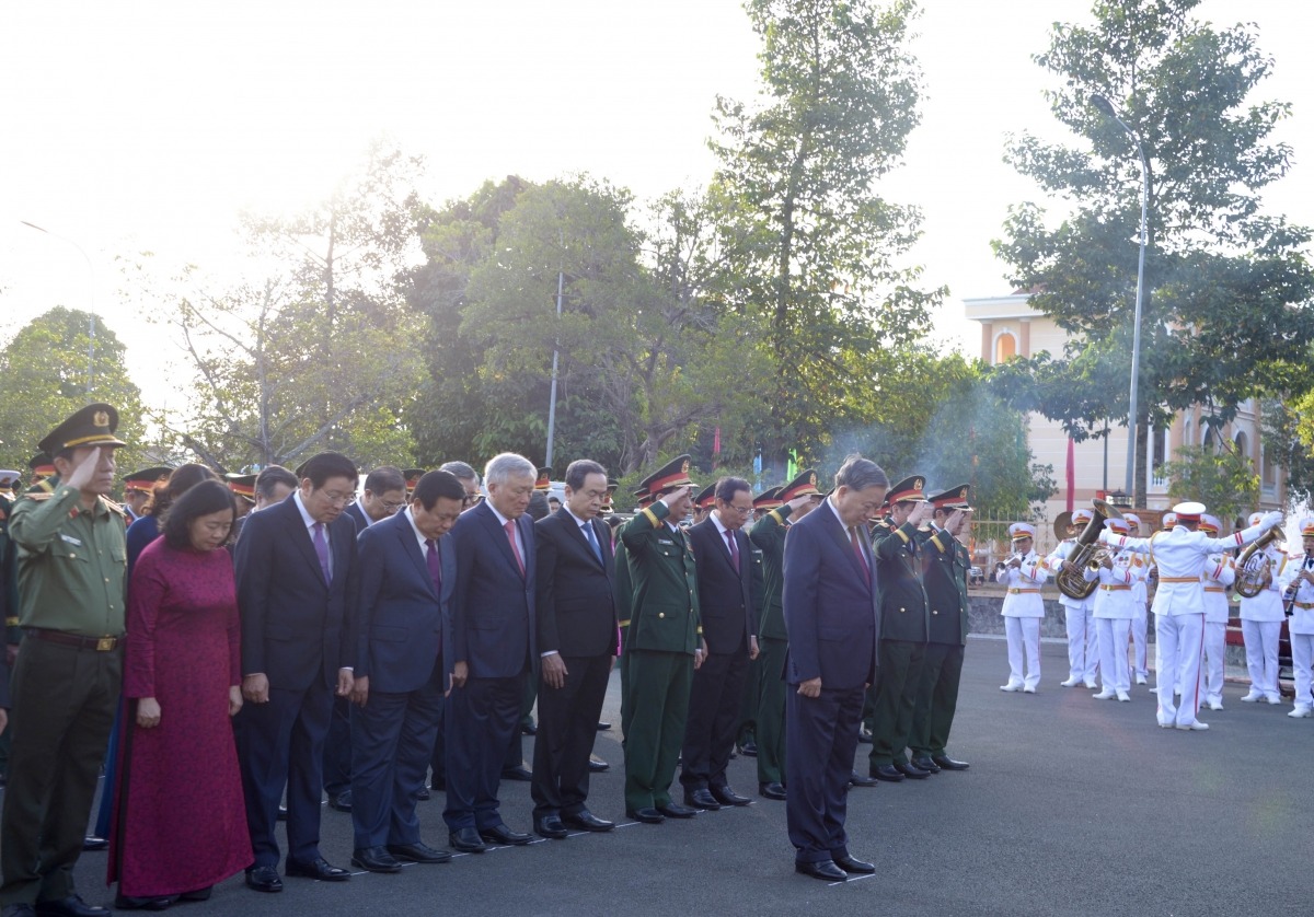 Đầu giờ sáng nay (8/12), trước khi tham dự lễ kỷ niệm, Tổng Bí thư Tô Lâm cùng đoàn công tác đã tới dâng hoa, dâng hương tại Nhà bia tưởng niệm các Anh hùng liệt sĩ; Tượng đài Chiến thắng và Nhà tưởng niệm Chủ tịch Hồ Chí Minh trong khuôn viên Quân khu 9. |