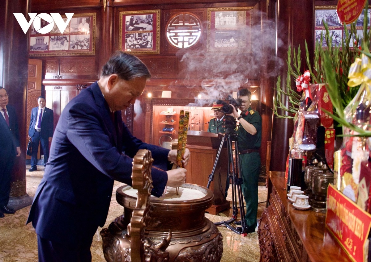 Tổng Bí thư Tô Lâm dâng hương tại Nhà tưởng niệm Chủ tịch Hồ Chí Minh trong khuôn viên Quân khu 9. |