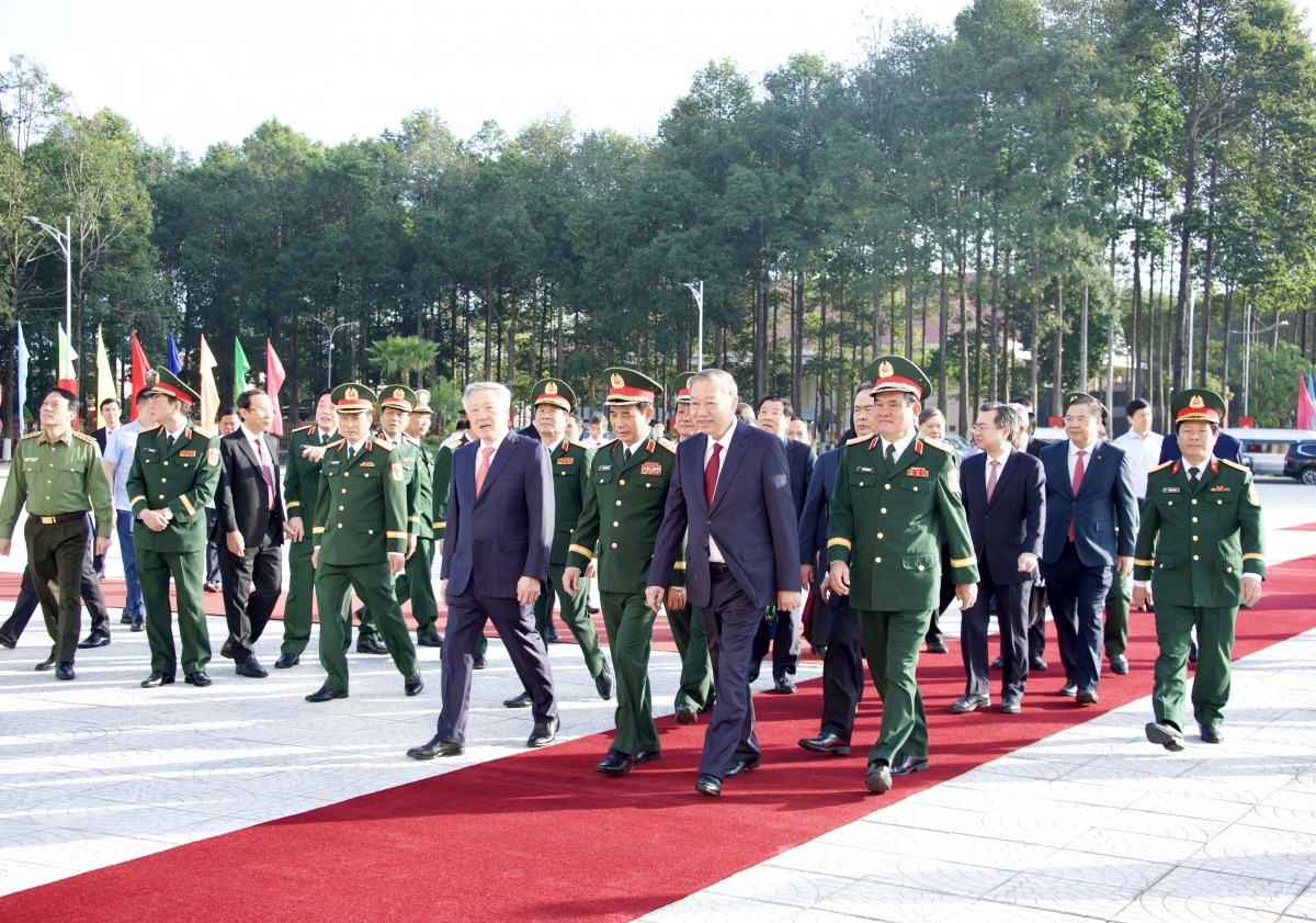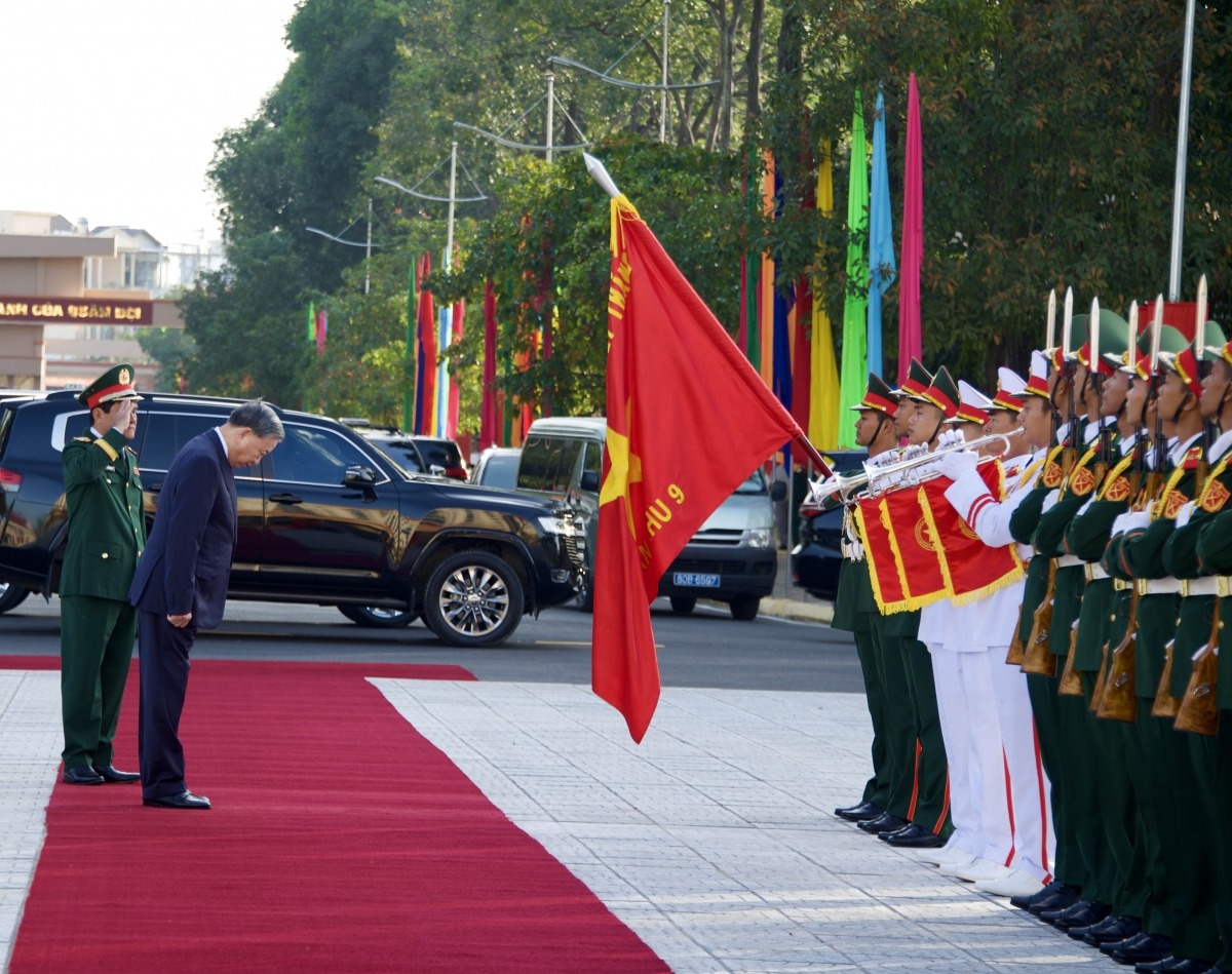 Lãnh đạo Bộ Quốc phòng và Quân khu 9 đón Tổng Bí thư Tô Lâm. |