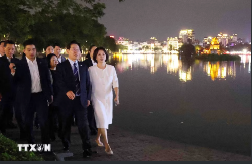 Một số hình ảnh Tổng thống Hàn Quốc Lee Jae Myung và Phu nhân Kim Hae Kyung đi dạo bên hồ Hoàn Kiếm do TTXVN ghi nhận:
