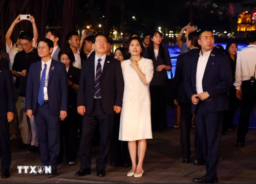 Tổng thống Hàn Quốc Lee Jae Myung và Phu nhân Kim Hae Kyung có những phút giây thư giãn bên hồ Hoàn Kiếm. Ảnh: TTXVN |