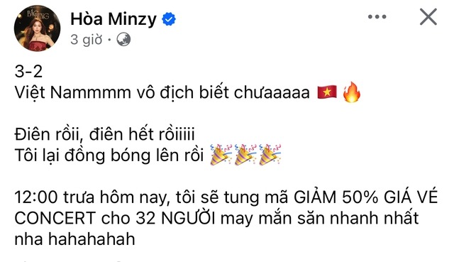 "Fan cứng" bóng đá Hoà Minzy quyết định giảm giá concert để ăn mừng (ảnh: FBNV) |