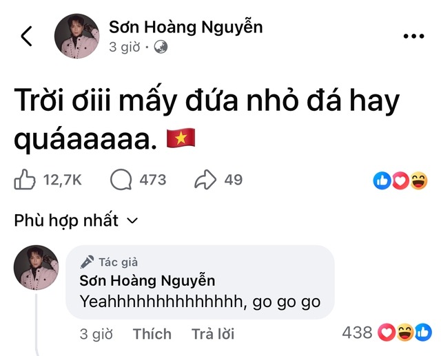 Ngay trong đêm, hàng loạt sao Việt đồng loạt chia sẻ niềm vui chiến thắng. Trấn Thành không giấu được sự phấn khích, đăng tải dòng trạng thái chúc mừng đầy tự hào dành cho các cầu thủ trẻ. Hòa Minzy cũng nhanh chóng hòa vào không khí ăn mừng, bày tỏ niềm xúc động trước tinh thần chiến đấu bền bỉ của đội tuyển.