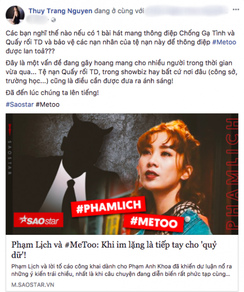 Mới đây, thông qua trang Facebook cá nhân, Trang Pháp chia sẻ bài viết về phong trào #MeToo của SAOstar, đồng thời đặt ra câu hỏi: “Các bạn nghĩ thế nào nếu có 1 bài hát mang thông điệp chống gj tình, quấy rối tình dục và bảo vệ các nạn nhân của tệ nạn này để thông điệp #Metoo được lan toả?”.