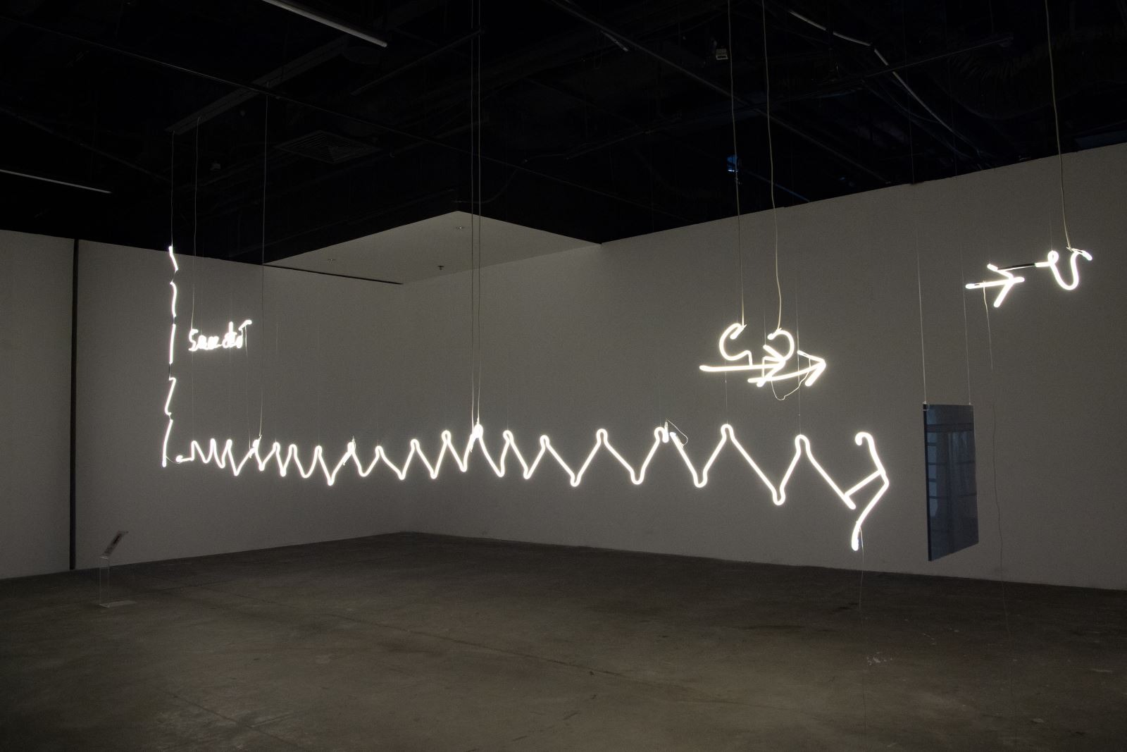 Nối tiếp là trạm 4: Miền Ý thức | Địa hạt của Trí tuệ nơi nghệ sĩ Đỗ Hiệp và nghệ sĩ Phạm Minh Hiếu sử dụng ánh sáng và dữ liệu như những ký hiệu của trí tuệ. Tại đây, ánh sáng không chỉ là hiện tượng vật lý mà là ẩn dụ cho khoảnh khắc con người vượt qua bóng tối mơ hồ để chạm tới tri thức mới.