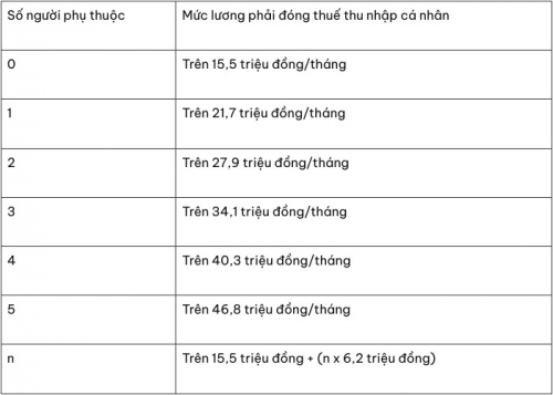 Dưới đây là bảng mức lương phải đóng thuế thu nhập cá nhân tương ứng với số lượng người phụ thuộc mà người nộp thuế có thể tham khảo: