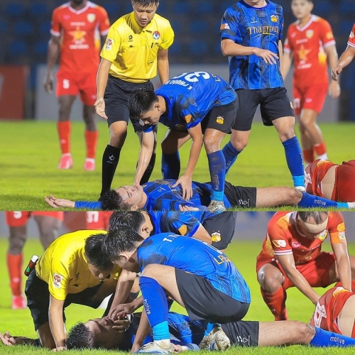 Trọng tài chính xem xét một hồi, cầu thủ cao 1m96 mới tỉnh táo. May mắn, anh chưa cắn lưỡi.