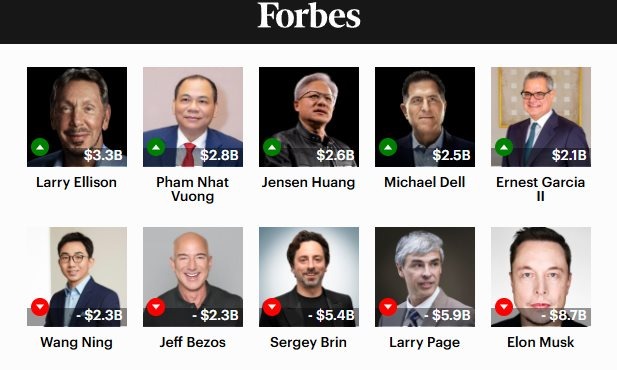 Mức tăng tài sản của tỷ phú Phạm Nhật Vượng là top 2 thế giới, chỉ trong 24 giờ qua. Ảnh: Forbes |
