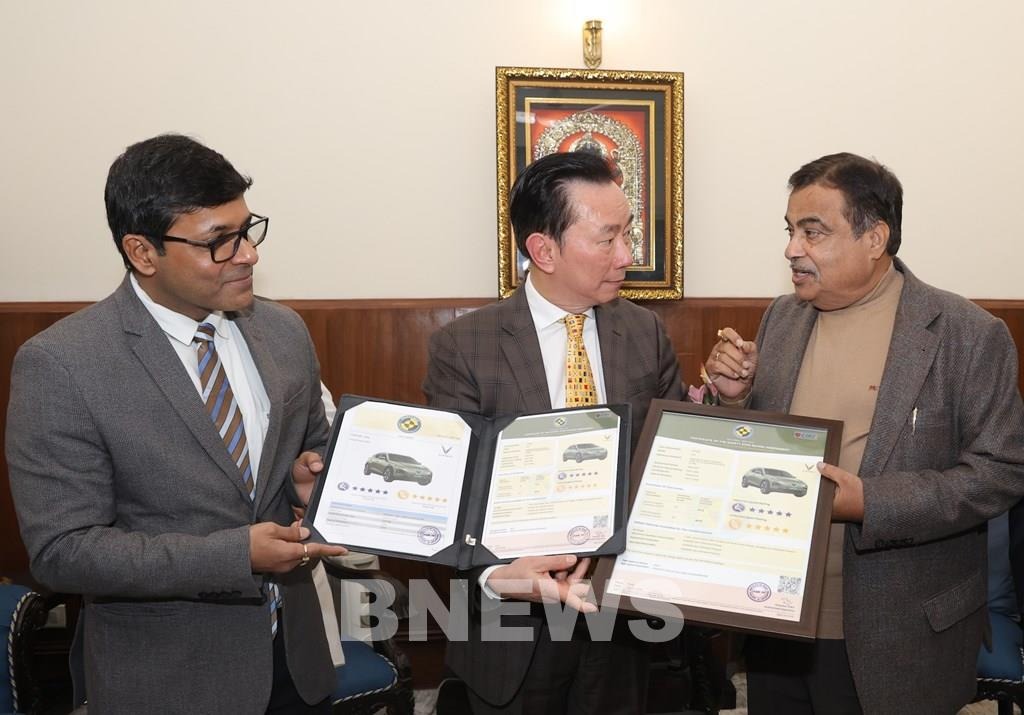 Ông Phạm Sanh Châu (giữa), CEO VinFast châu Á, và ông Tapan Ghosh (trái), CEO VinFast Ấn Độ, nhận chứng chỉ an toàn BNCAP 5 sao cho mẫu xe VF 7 từ ông Nitin Gadkari, Bộ trưởng Giao thông Đường bộ và Cao tốc Ấn Độ. |
