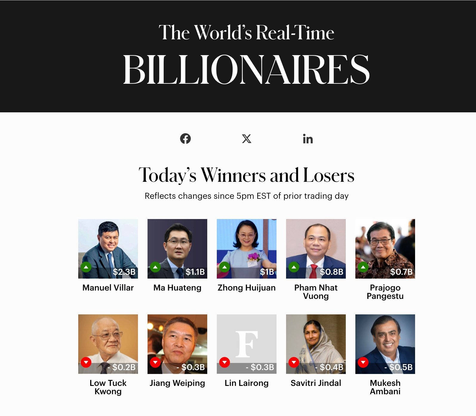 Trong nhóm “Today’s Winners and Losers” của Forbes, ông Phạm Nhật Vượng nằm trong top những tỷ phú có tài sản tăng mạnh nhất ngày, xếp sau ông Manuel Villar (+2,3 tỷ USD), ông Ma Huateng (+1,2 tỷ USD) và bà Zhong Huijuan (+1,1 tỷ USD).