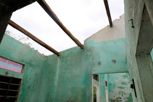 Căn nhà tạm bợ của mẹ con bà Nguyễn Thị Phúc bị xuống cấp nghiêm trọng sau cơn bão số 10 – nơi hai mẹ con sinh sống suốt nhiều năm qua. |