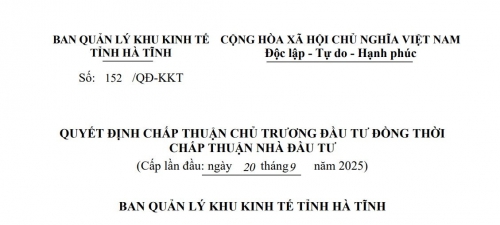 Cụ thể, doanh nghiệp được tỉnh Hà Tĩnh cấp quyết định cho dự án đầu tư xây dựng nhà xưởng cho thuê sản xuất ngành phụ trợ ô tô điện (mã ngành theo VSIC: 6810).