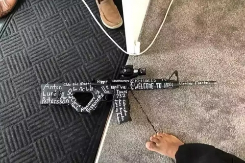 Một khẩu súng trường kiểu airsoft có ghi chú về những kẻ xả súng hàng loạt khét tiếng đã được tìm thấy tại hiện trường. Ảnh: Beritasatu.com |