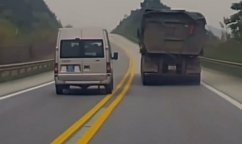 Chiếc xe biển xanh đã lấn sang làn ngược chiều để vượt lên một xe tải khác.